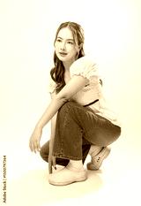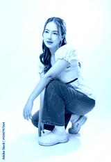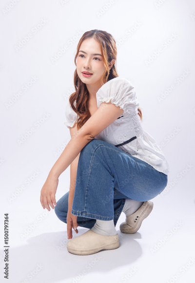 Asian young beautiful woman cheerful confident long curl wavy hair wearing white puff sleeve blouse with floral embroidery black ribbon blue jeans, look at camera sitting posing on white background.
