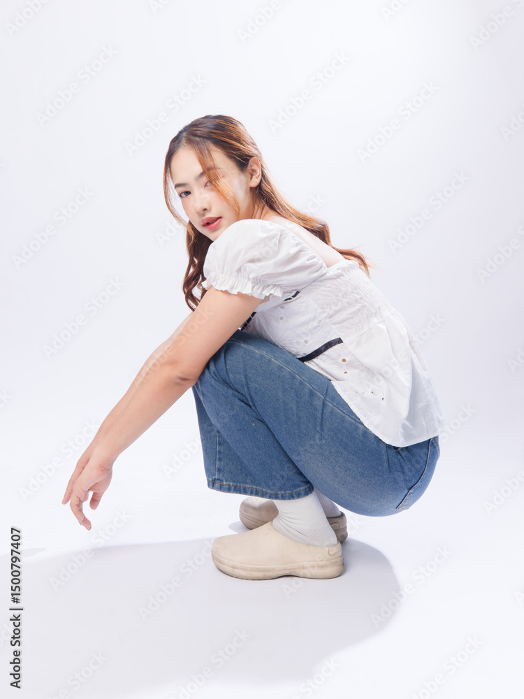Asian young beautiful woman cheerful confident long curl wavy hair wearing white puff sleeve blouse with floral embroidery black ribbon blue jeans, look at camera sitting posing on white background.