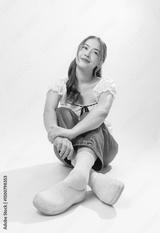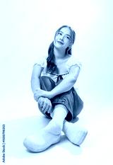 Asian young beautiful woman cheerful confident long curl wavy hair wearing white puff sleeve blouse with floral embroidery black ribbon blue jeans, look at camera sitting posing on white background.