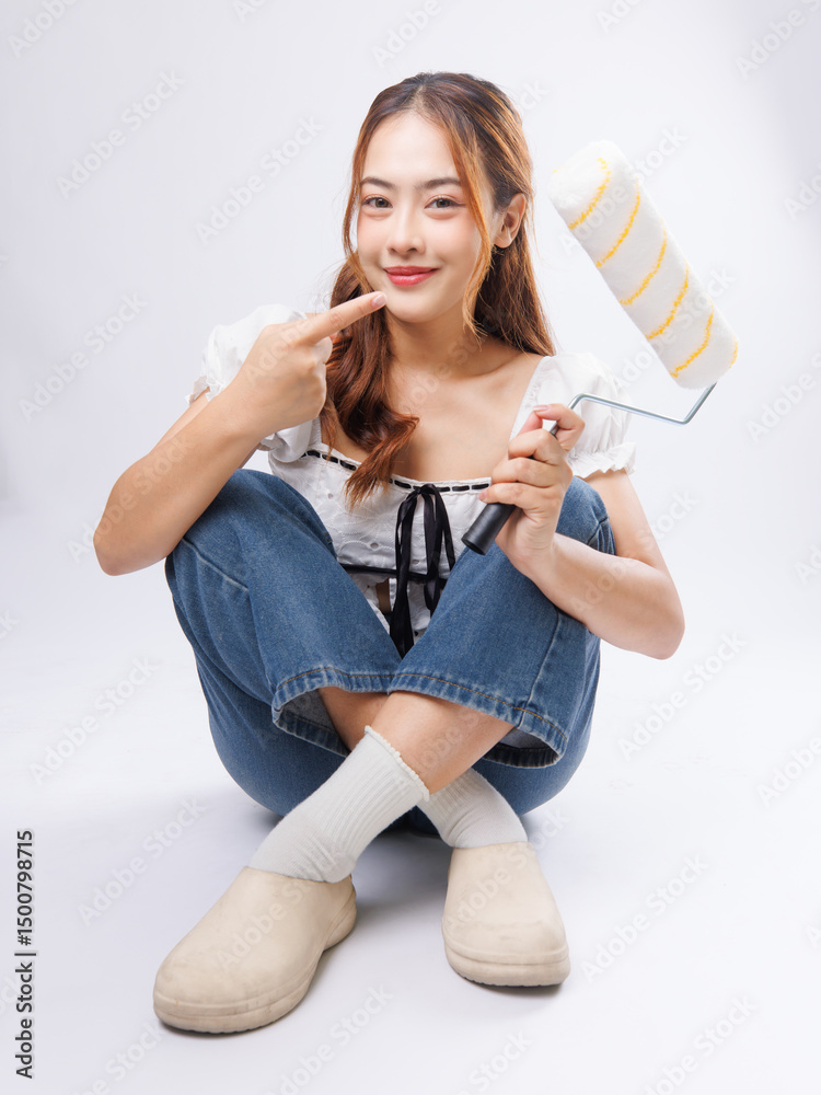 Asian young beautiful woman cheerful confident long curly wavy hair wearing white puff sleeve blouse blue jeans holding paint rollers brush sitting posing on white background renovation room concept.