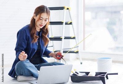 Asian young beautiful woman long curly hair wearing blue shirt jean sit on floor look at laptop computer planing before repairing room painting wall house or apartment rollers brush ladder background.