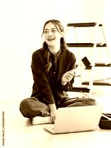 Asian young beautiful woman long curly hair wearing blue shirt jean sit on floor look at laptop computer learning before repairing room painting wall house or apartment rollers brush ladder background
