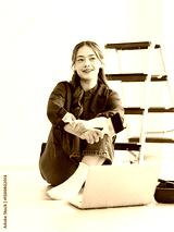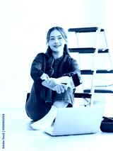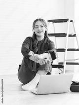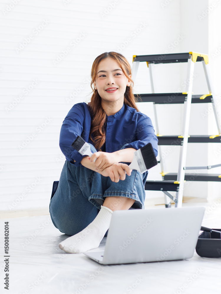 Asian young beautiful woman long curly hair wearing blue shirt jean sit on floor look at laptop computer learning before repairing room painting wall house or apartment rollers brush ladder background