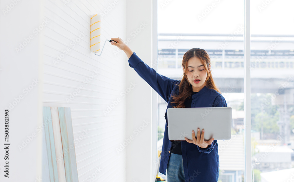 Asian young beautiful woman long curly hair wearing blue shirt jeans standing looking learning laptop computer while repairing room painting wall empty house or apartment decor renovating room concept