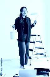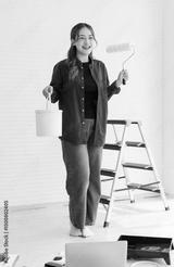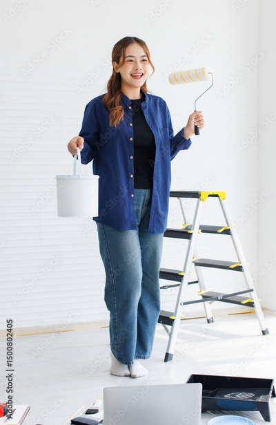 Asian young beautiful woman long curly hair wearing blue shirt jeans standing pose look at camera while repairing room around rollers brushes paint bucket ladder renovate decorating house or apartment
