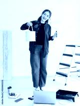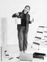 Asian young beautiful woman long curly hair wearing blue shirt jeans standing pose look at camera while repairing room around rollers brushes paint bucket ladder renovate decorating house or apartment
