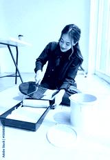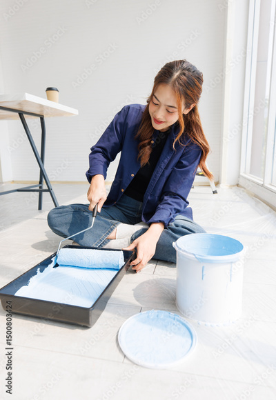 Asian young beautiful woman smiling cheerful happy long curly hair wearing blue shirt jeans sitting, prepare paint roller into tray light blue wall renovation decoration new house or apartment concept