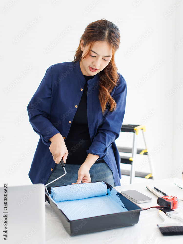 Asian young beautiful woman smiling cheerful happy long curly hair wearing blue shirt jeans standing comparing colors paint roller tray light blue wall renovation decoration house or apartment concept