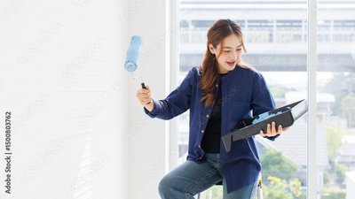 Asian young beautiful woman smiling cheerful long curly hair wearing blue shirt jeans sitting on ladder painting wall with roller brush light blue for new home repair renovation decoration concept.