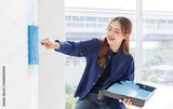 Asian young beautiful woman smiling cheerful long curly hair wearing blue shirt jeans sitting on ladder painting wall with roller brush light blue for new home repair renovation decoration concept.