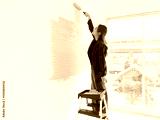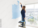 Asian young beautiful woman smiling cheerful long curly hair wearing blue shirt jeans standing on ladder painting wall with roller brush light blue for new home repair renovation decoration concept.