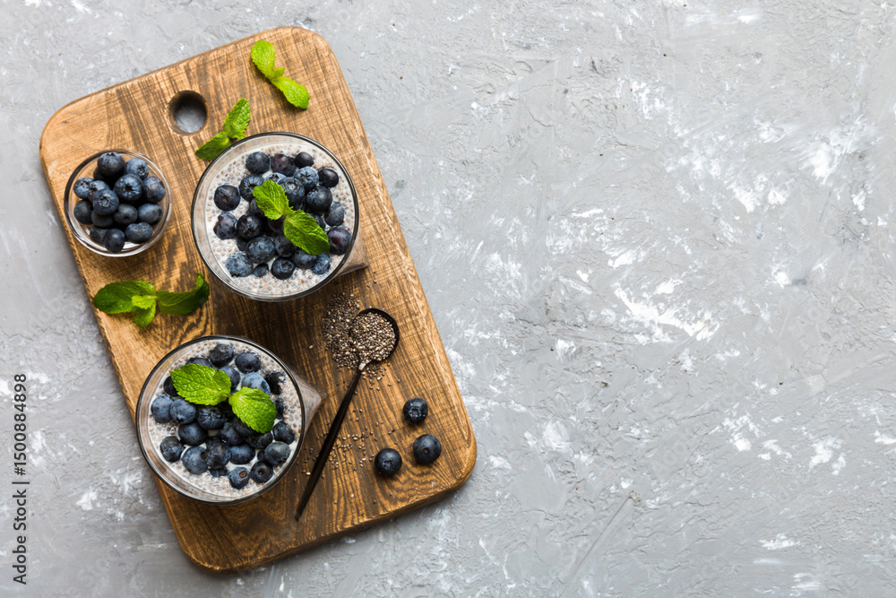 Healthy breakfast or morning with chia seeds vanilla pudding and blueberry berries on table background, vegetarian food, diet and health concept. Chia pudding with coconut milk and blueberry