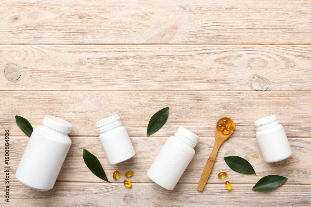 Omega-3 capsules lie in white bottle on a table with green leaves background. Fish oil tablets. Biologically active additives. omega 6, omega 9, vitamin A, E, D, vitamin D3 top view with copy space