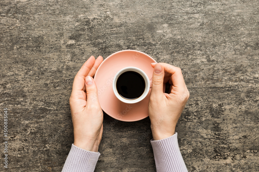 Minimalistic style woman hand holding a cup of coffee on Colored background. Flat lay, top view espresso cup. Empty place for text, copy space. Coffee addiction. Top view, flat lay