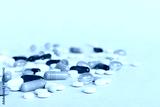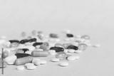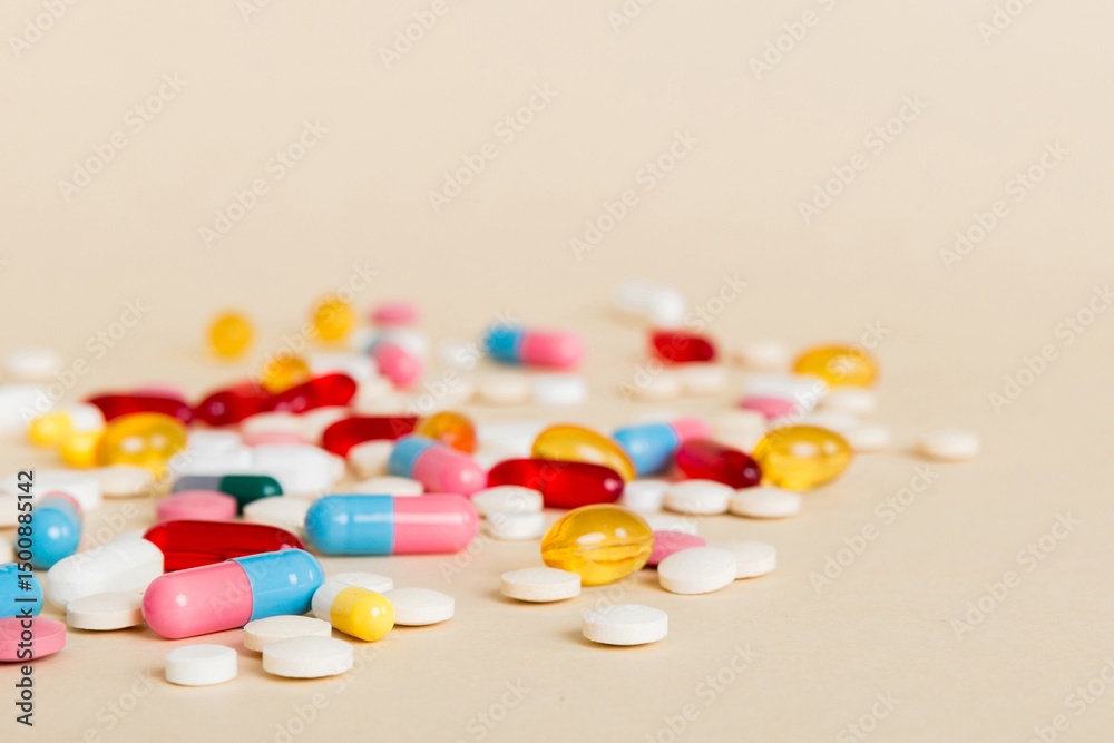 Many different colorful medication and pills perspective view. Set of many pills on colored background