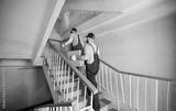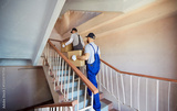 Professional movers in uniform carrying cardboard boxes upstairs in residential building. Workers providing relocation service, transporting packages and ensuring smooth moving process for clients.