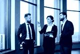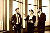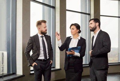 Woman realtor with clipboard in hands demonstrating business space to rent for two businessmen clients, advertising property, consulting about price on market, talks with prospective buyers