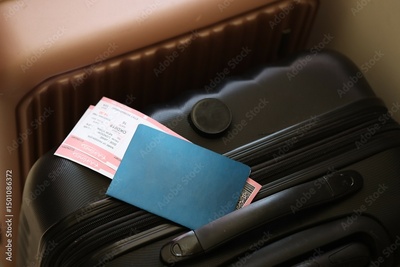 Empty passport with tickets lies on touristic suitcase close up in airport waiting hall
