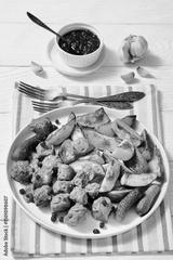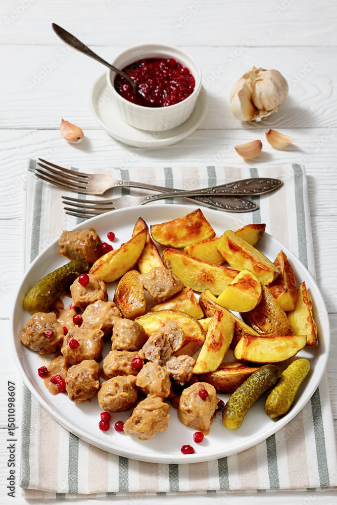 meatballs, potatoes, pickles, berries on a plate