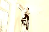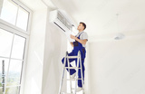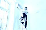 Man worker or a technician, installing, inspecting and maintaining the home or office air conditioner, ensuring its optimal performance and efficiency for comfortable living conditions.