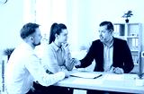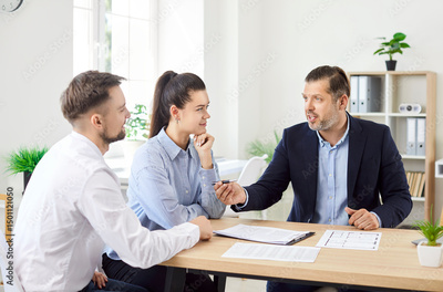 Couple of clients engaged in meeting with a financial consultant or insurance agent in an office setting. Discussing investments and receiving assistance, highlighting importance advice for clients.