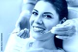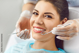 Portrait of happy smiling woman looking cheerful at camera sitting in dentistry clinic during medical check up. Close up of female patient treating teeth at dentist office. Teeth care concept.