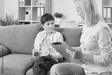 Portrait of a friendly young female psychologist woman doctor talking with her child boy patient sitting on sofa in office during therapy session. Psychotherapy and kids mental health concept.