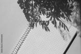 Spiral checkered white paper notepad on the pink table with leaves shadows. Copy space