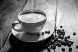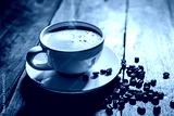 Coffee cup and coffee beans on wooden table, Espresso Crema coffee cup aromatic