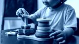 Kid playing with wood toys at preschool classroom. Kindergarten education games for children