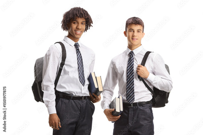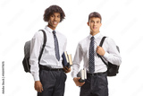 African american and caucasian student in holding books and backpacks