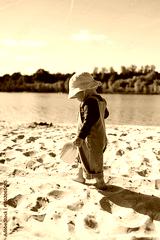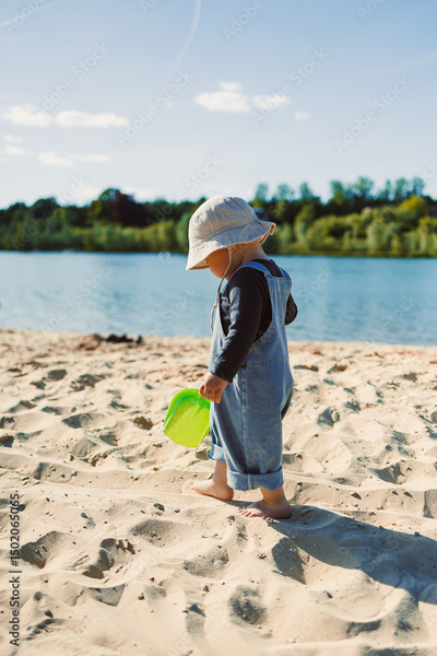 Happy 2 year old little boy playing on sand during summer vacation, wearing hat. Family travel and vacation, outdoor activities on summer beach holiday with children.