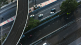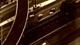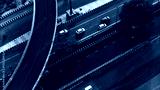 Top down cross traffic highway with cars, trucks aerial. Urban transportation at bridge road at Delhi. Cinematic cityscape of downtown freeway drone shot. Noida Freeway.