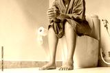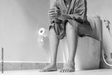 Woman sitting on the toilet bowl in the bathroom. She has stomach ache. Poor digestive system. Constipation. Diarrhea. Food poisoning. Health and medicine.