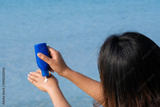 Hand of female holding sunscreen. Very sun light Sky background.Health concepts and skin care