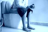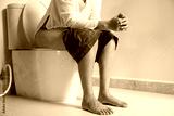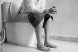 Woman sitting on the toilet bowl in the bathroom. She has stomach ache. Poor digestive system. Constipation. Diarrhea. Food poisoning. Health and medicine.