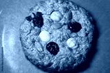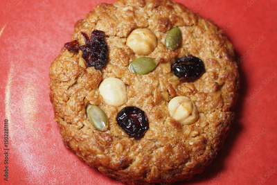 Oatmeal cookie with nuts and dried fruit on red background