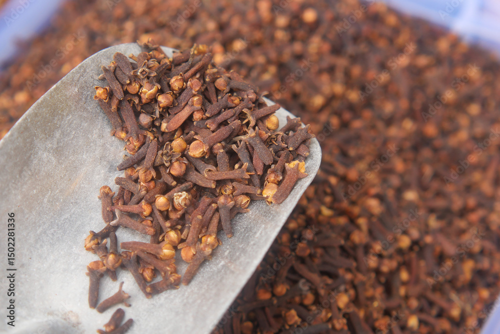 Cloves are being scooped from a large container in a market