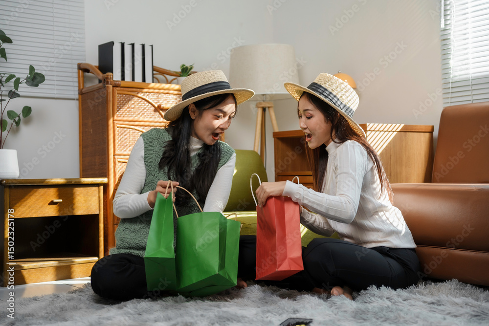 Two joyful female friends unboxing shopping bags at home, sharing laughter and excitement over their recent purchases and surprises
