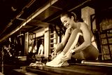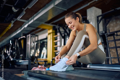 Happy sportswoman tying shoelace during gym workout.