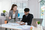 Business professionals analyzing investment graphs and financial charts on laptops during a strategic meeting in a modern office environment.