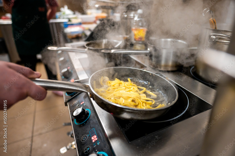 A professional chef prepares steaming pasta in a frying pan on a stovetop. The background features kitchen utensils and ingredients, creating a dynamic culinary atmosphere.