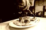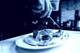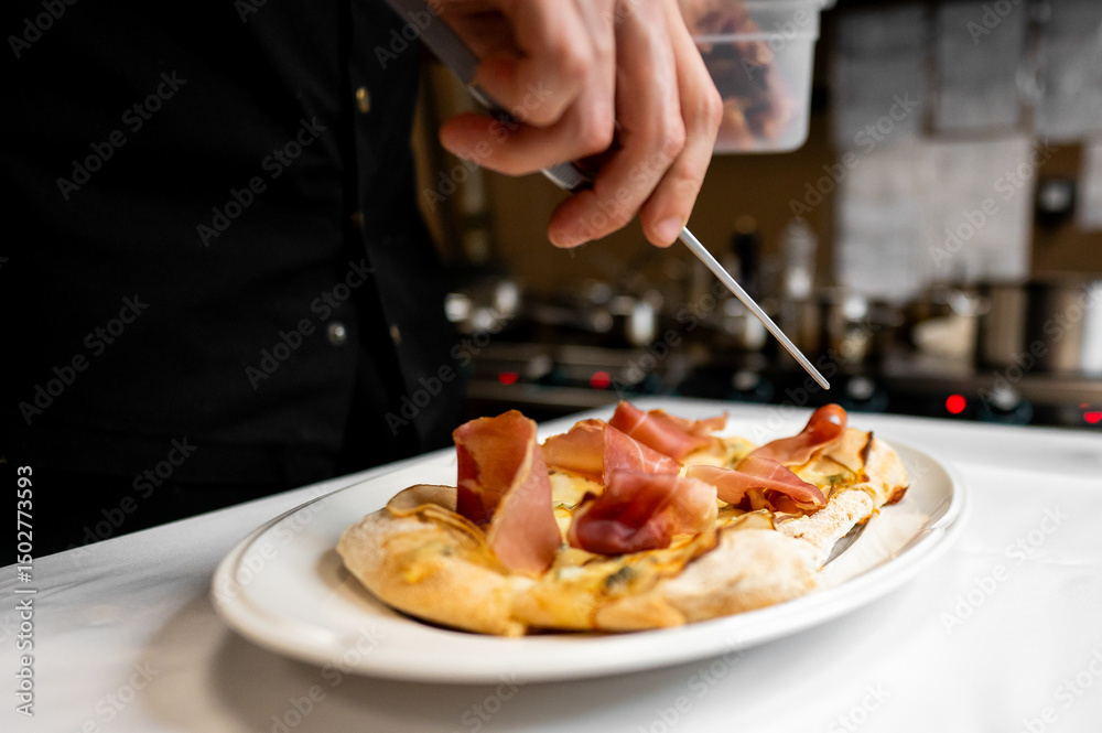 A professional chef carefully prepares a dish, adding slices of cured meat to a flatbread in a restaurant kitchen. Culinary expertise and food presentation are highlighted in this close-up scene