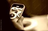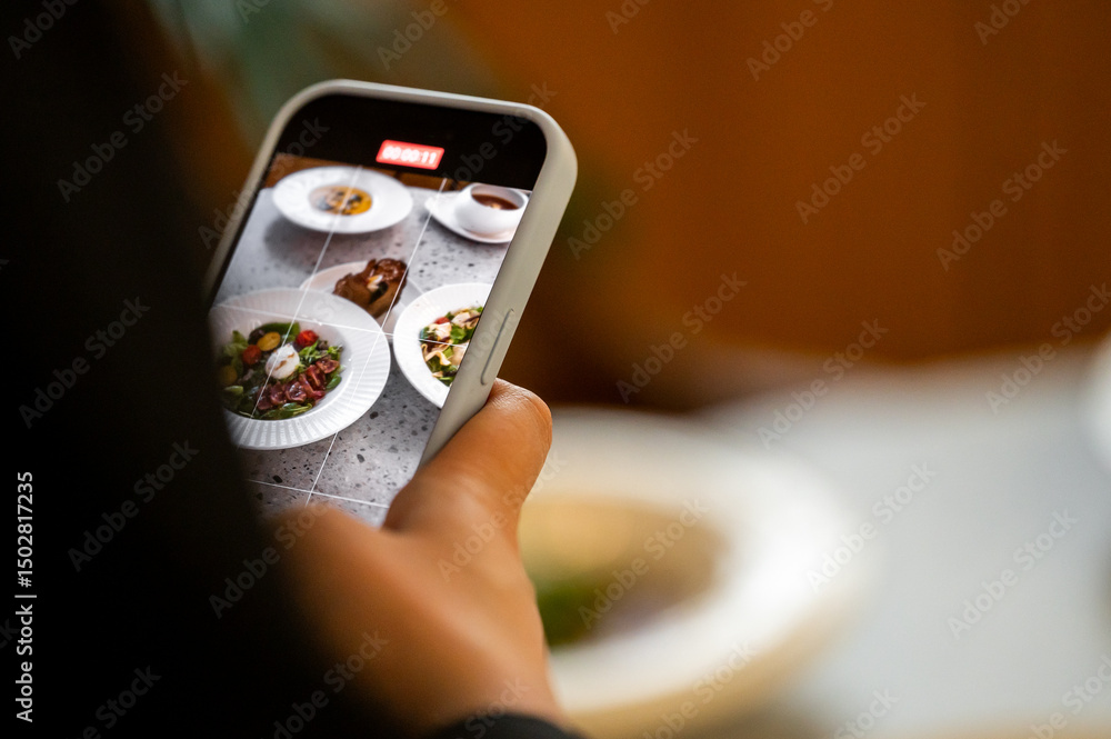 A close-up of a hand holding a smartphone, capturing a food photo. The screen displays various dishes, including salad, meat, and soup, with a focus on food photography and digital dining trends