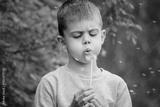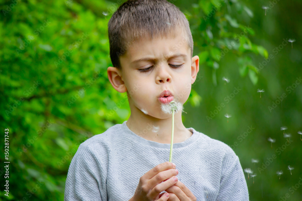 Boy blowing on a dandelion. Allergy.