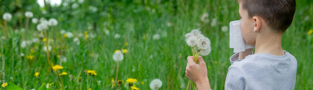 The boy has allergies.He is blowing on a dandelion. Seasonal allergies. Runny nose,spray and tissue.