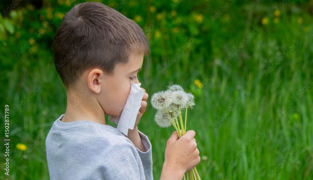 The boy has allergies.He is blowing on a dandelion. Seasonal allergies. Runny nose,spray and tissue.