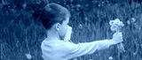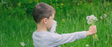 The boy has allergies.He is blowing on a dandelion. Seasonal allergies. Runny nose,spray and tissue.