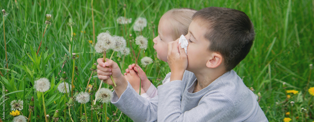 Allergy in a boy and a girl to dandelion. Blowing on a dandelion. Seasonal allergy in a child.