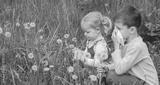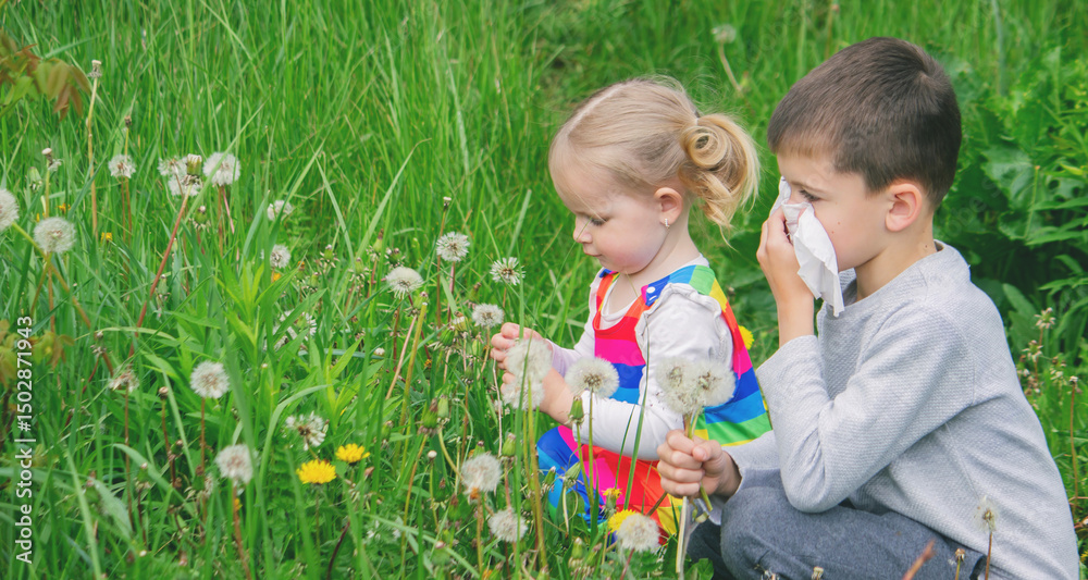 Allergy in a boy and a girl to dandelion. Blowing on a dandelion. Seasonal allergy in a child.